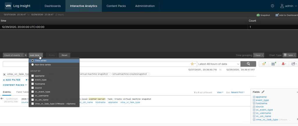 We create a table view for events. Below is for snapshots taken in the last 48 hours , we can then add additional information by clicking on time series button and adding group by fields.