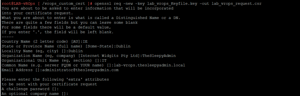 Enter in the details for the cert. These can also be pre creating using a .config file but I just typed them in to the ssh console.