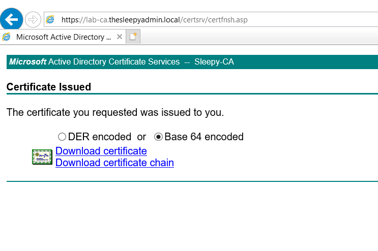 Click submit and the certificate should be generated. The cert needs to be downloaded as base 64.