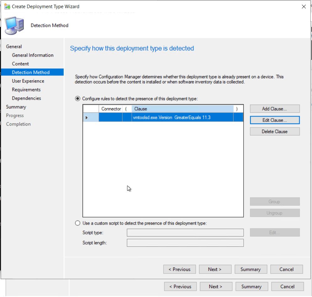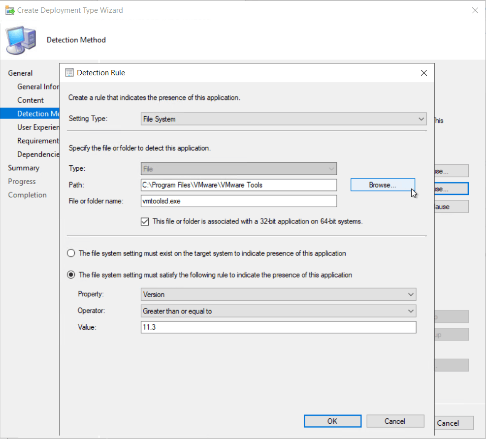 Next set a detection method this can be either MSI install code if available but I used file version for the vmtoolsd.exe.