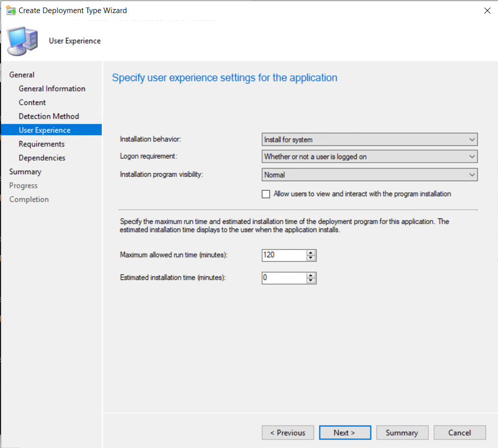 Set the install behavior to Install for system and logon requirement to Whether or not a user is logged on.