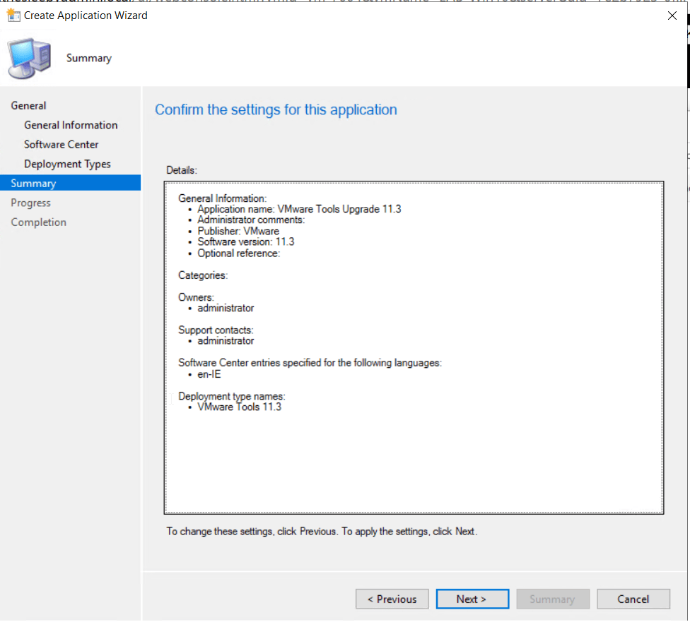 I didn’t set any requirements or dependencies. Review the summary page and then complete the application wizard.