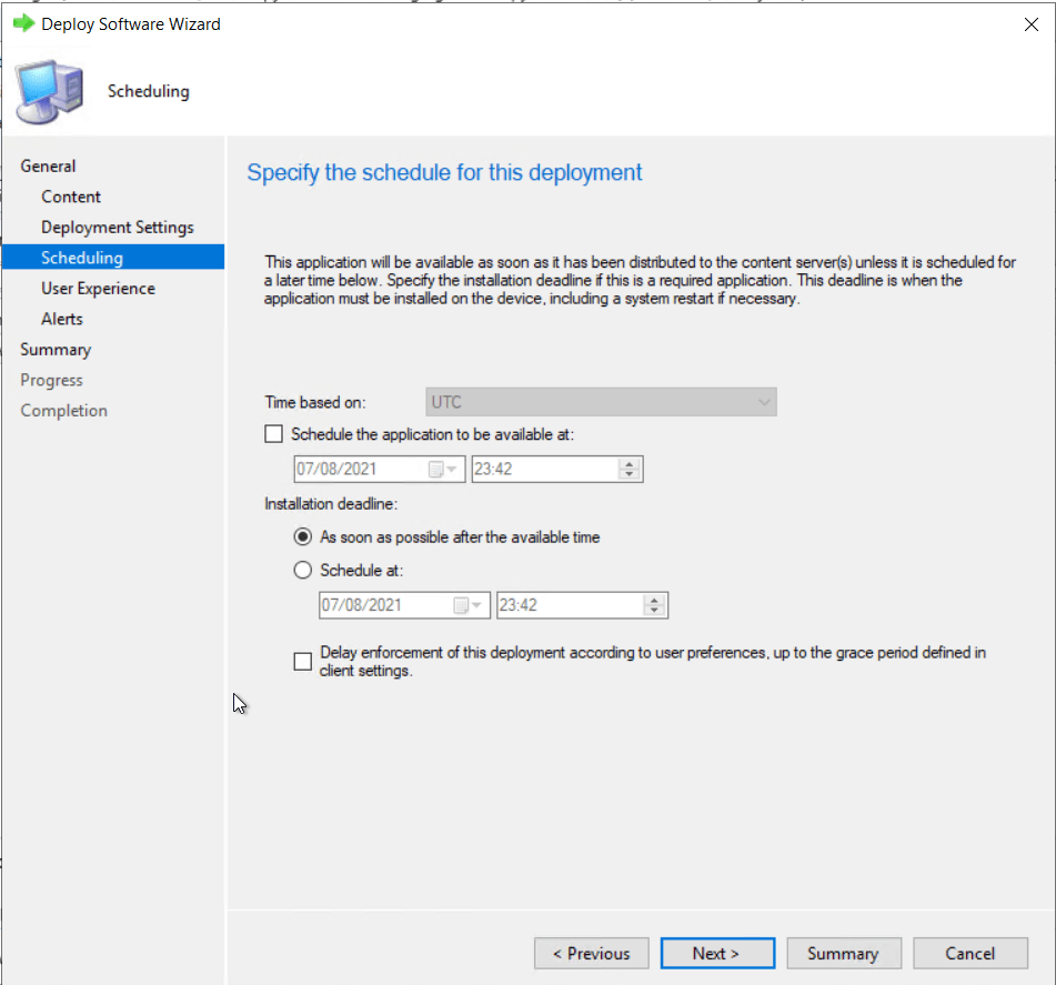 For scheduling I setup as soon as possible but this can be set to what ever time the application should start to install.