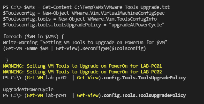 Write-Warning "Setting VM Tools to Upgrade on PowerOn for $VM"