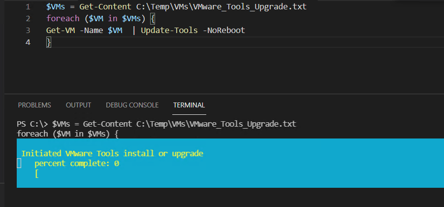 $VMs = Get-Content C:\Temp\VMs\VMware_Tools_Upgrade.txt