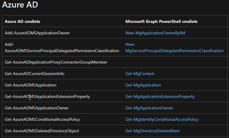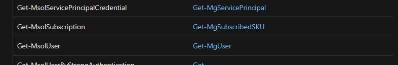 First stop I usually do is to check if the commands have direct replacements, we can use the below learn page to check. The page will have tables with the Azure AD / MSOL command and then the replacement command if one exist in the second row.