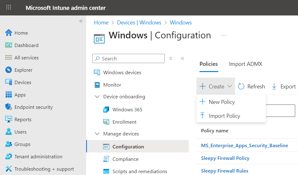 Logon to the Intune Admin portal > Devices > Windows > Configuration > Create New Policy.
