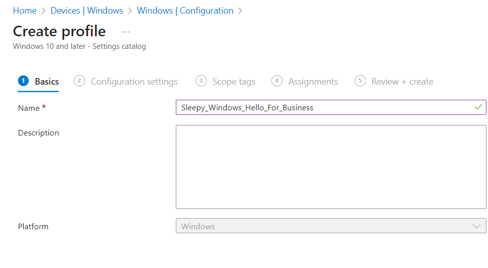 Select platform Windows 10 and Later and profile type Settings Catalog, click Create