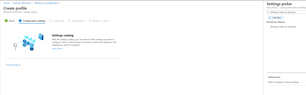 Click add settings and search for Windows Hello for Business.