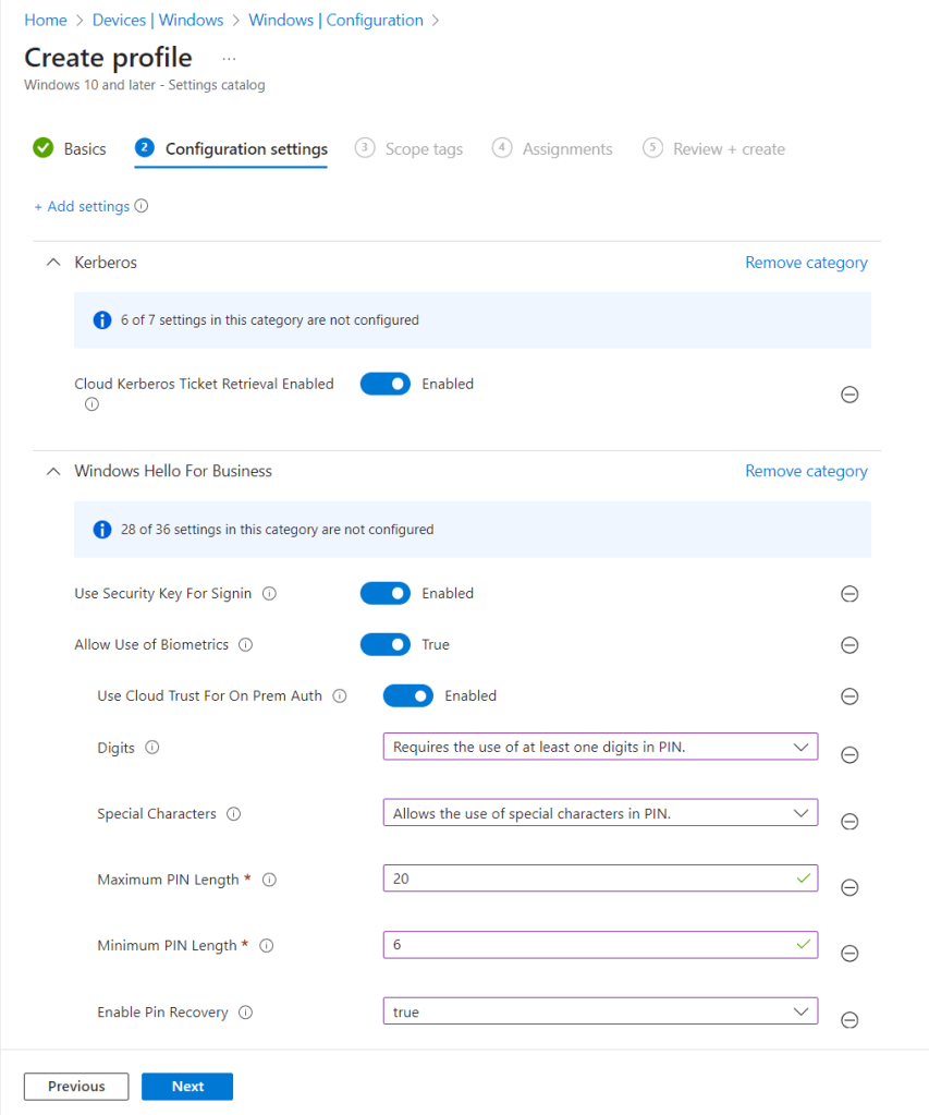 Next we need to go to Intune and Configure the Windows Hello for Business policy.