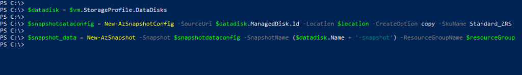 Next we get the VM that we will create a snapshot of the disk. We will be using the $vm variable to get the disk and for recreating the VM later to keep the existing configuration.