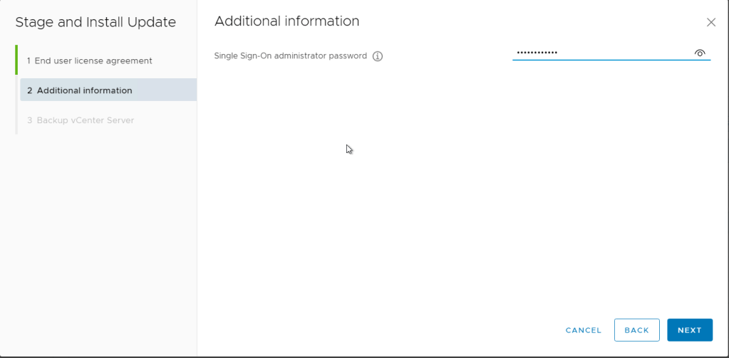 This will run a pre-check on vCenter before the upgrade will continue. Once no issue are found put in the administrator’s password.