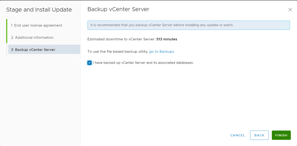 There are a few different way’s to update to vCenter server appliance (VCSA). In this post we will be going through using CLI method to apply vCenter patches. Before updating VCSA make sure you have a current backup and take a snapshot before proceeding in case of any issues with the update.
