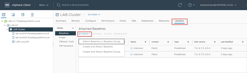 The baseline can be assigned to the host individually or the cluster. I am going to apply to the cluster. Go to the Cluster and select Updates > Attach.