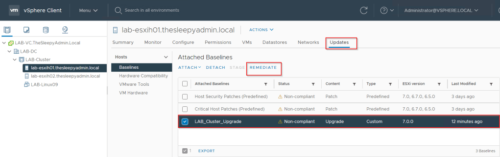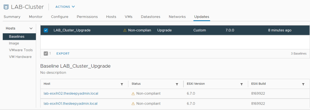 The baseline can be applied either directly to the ESXi host or to the cluster we will be applying to the cluster as it saves time having to apply to each host individually .