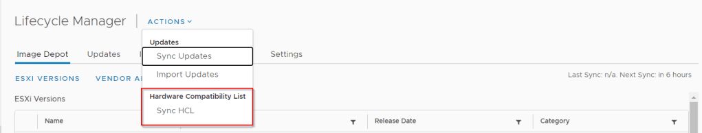 We then need to sync the hardware compatibility list. Click Actions > Sync HCL
