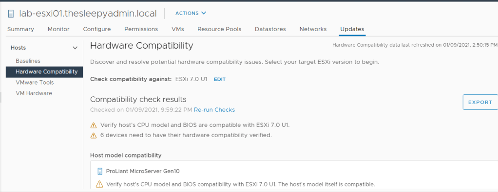 Once synced we can run a compatibility check from the Host > Updates > Hardware Compatibility
